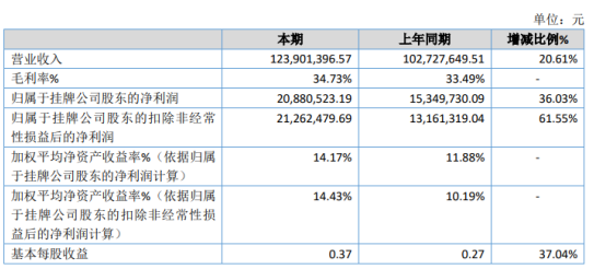 挖贝网4月7日,安信种苗(831492)近日发布2020年度报告,报告期内公司实现营业收入123,901,396.57元,同比增长20.61%;归属于挂牌公司股东的净利润20,880,523.19元,同比增长36.03%。