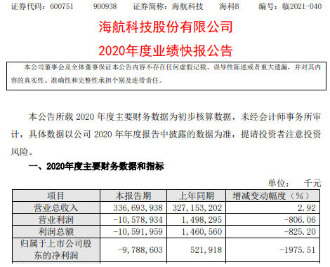 挖贝网4月7日,海航科技(600751)发布2020年度业绩快报公告,公告显示,2020年1-12月营业总收入为3366.94亿元,比上年同期增长2.92%;归属于上市公司股东的净利润为-97.89亿元,较上年同期由盈转亏。