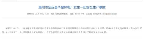 据介绍,4月7日10时许,上海龙净环保公司在滁州市定远县华塑热电厂脱硫制浆罐顶进行焊接堵漏作业时发生闪爆,造成6名作业人员从罐顶(高约5米)坠落,1人当场死亡、5人送医院抢救无效后死亡。省应急管理厅主要领导率相关处室负责同志已赶赴现场指导处置。