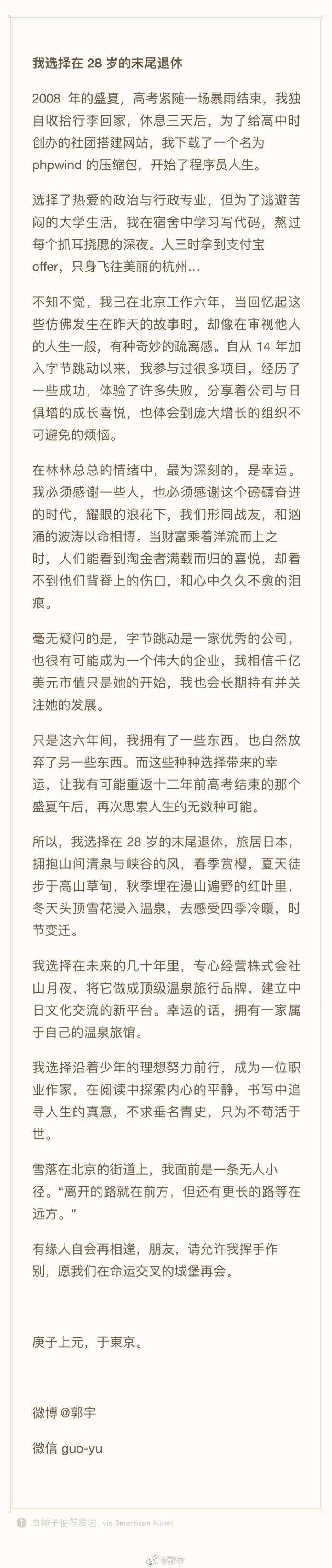 2020年2月,郭宇在个人微博发文称:“我选择在28岁的末尾退休,拥抱山间清泉与峡谷的风,去感受春秋冬夏。有缘人自会再相逢,朋友,愿我们在更广阔的世界再会!”