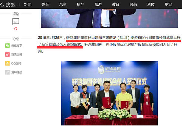 2019年4月25日,轩鸿集团肖建海与粤群龙(深圳)投资有限公司董事长彭武豪,举办了资管战略合伙人签约仪式,计划将小股操盘的房地产股权投资模式引进轩鸿。