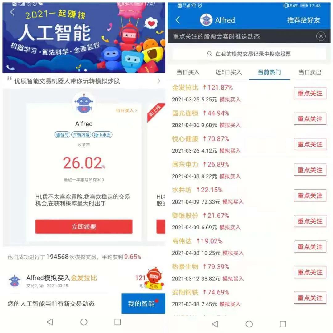 除此之外,机器人还抓住了安阳钢铁、国光连锁、悦心健康等大牛股,俗话说:新手死于追高,老手死于抄底。由此可以看出,盲目的投资并不能带来收益;大多数人炒股或多或少会受到个人情绪等主观因素影响,而我们的Alfred机器人刚好可以弥补这个不足。