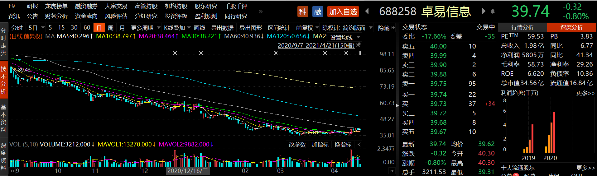 资本邦注意到,卓易信息自2020年8月以来整体股价走下坡路,截至4月20日,公司股价报收40.06元/股。