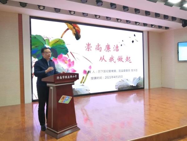 区纪委常委、区监委委员、济南市棋盘街小学廉育副校长贺冰洁为同学们带来了廉育第一课《崇尚廉洁从我做起》。贺校长从出淤泥而不染的济南市花——莲花讲起,通过白居易怒打行贿人、狄仁杰、包拯等我国家喻户晓的古代官员的廉洁故事,深入浅出地引导学生们认识到廉洁不仅是个人修养,更是利国利民的大事。