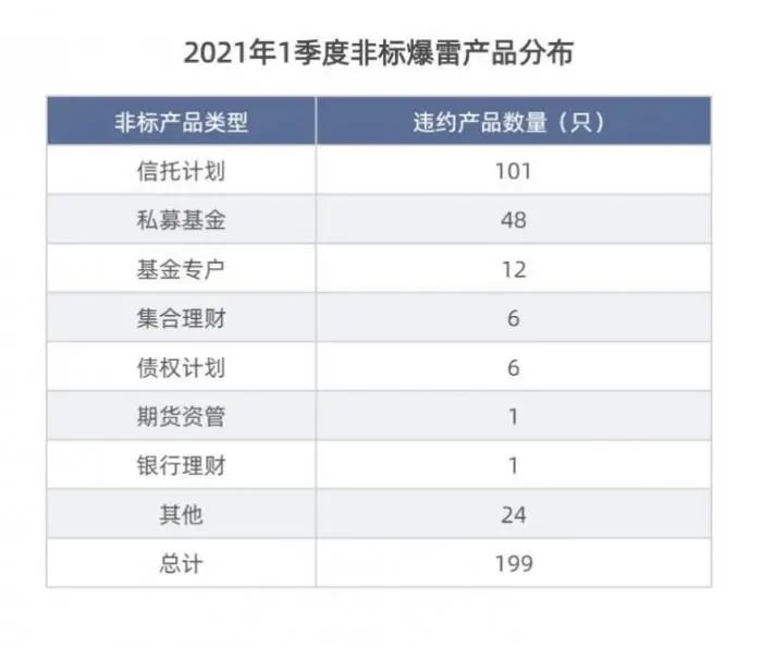 据相关机构不完全统计,2021年一季度发生过违约的风险产品共计199只,涉及信托计划、私募基金、基金专户、券商集合理财、债权计划等资管产品。这些非标资产产品中,爆雷最多的是信托计划,产品总数高达101个。