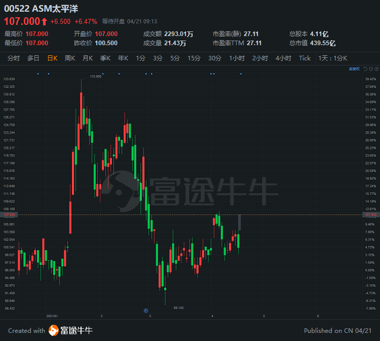 富途资讯4月21日消息,截至发稿,ASM太平洋现涨6.47%,报107港元。