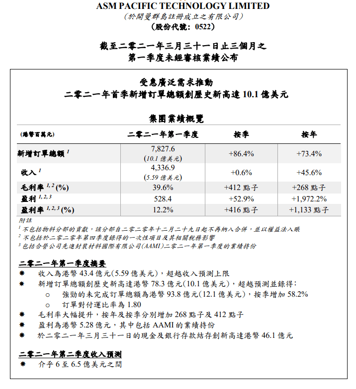 ASM太平洋公布2021年第一季度业绩,持续经营业务收入为港币43.4亿元(5.59 亿美元),超越收入预测上限,环比增长0.6%,同比增长45.6%。新增订单总额创历史新高达港币78.3亿元(10.1 亿美元),超越预测,环比增长86.4%,同比增长73.4%。公司持有人应占盈利约5.22亿港元,同比增长21.1倍。每股基本盈利为港币1.27元。