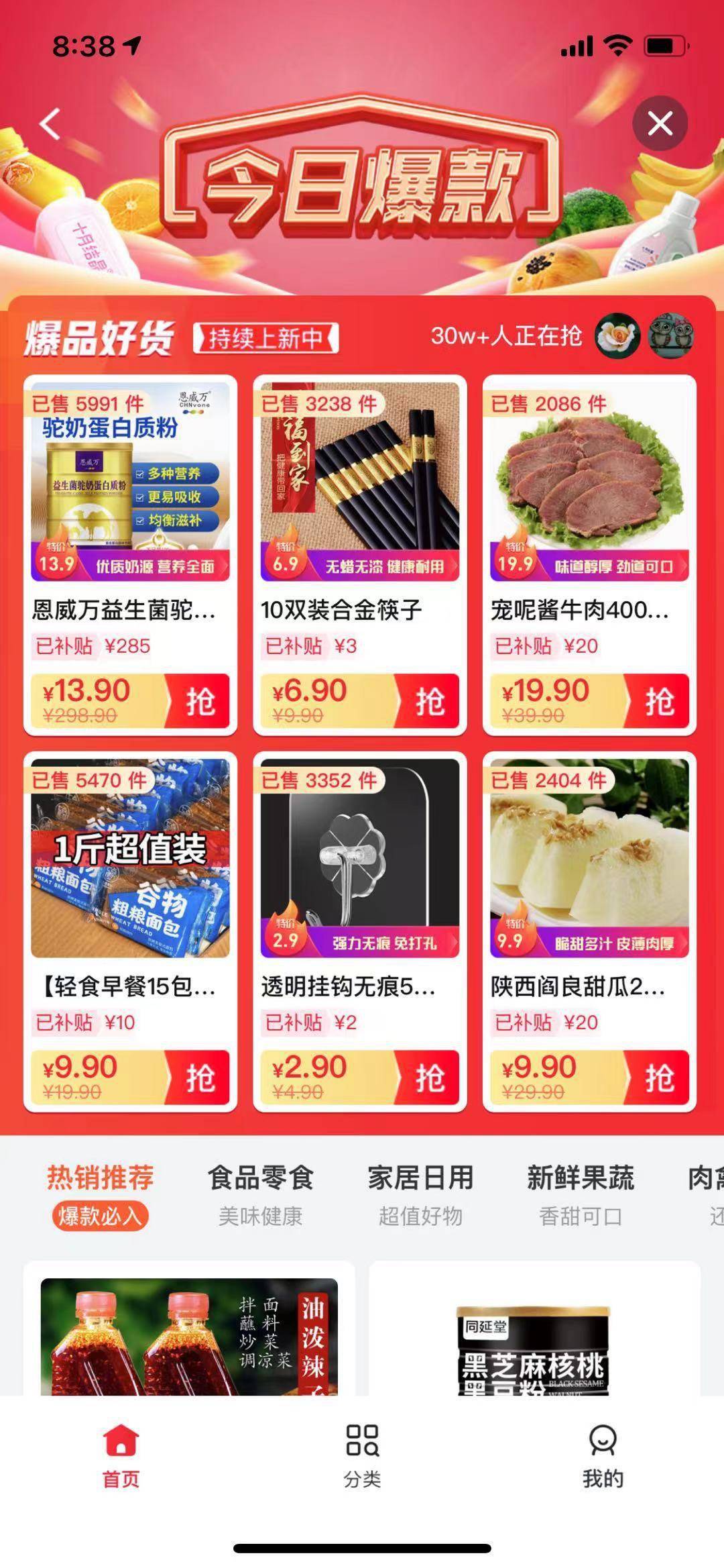 19.9元400克的袋装酱牛肉、6.9元10双的铝合金筷子、6.9元30只的烤虾干、9.9元一桶水果燕麦……进入“今日爆款”的页面后,不少单价不高的小零食、日用品映入眼中。从商品类别看,“今日爆款”主要提供生活类商品,涵盖蔬果、粮油、百货、数码、母婴、家电等品类。