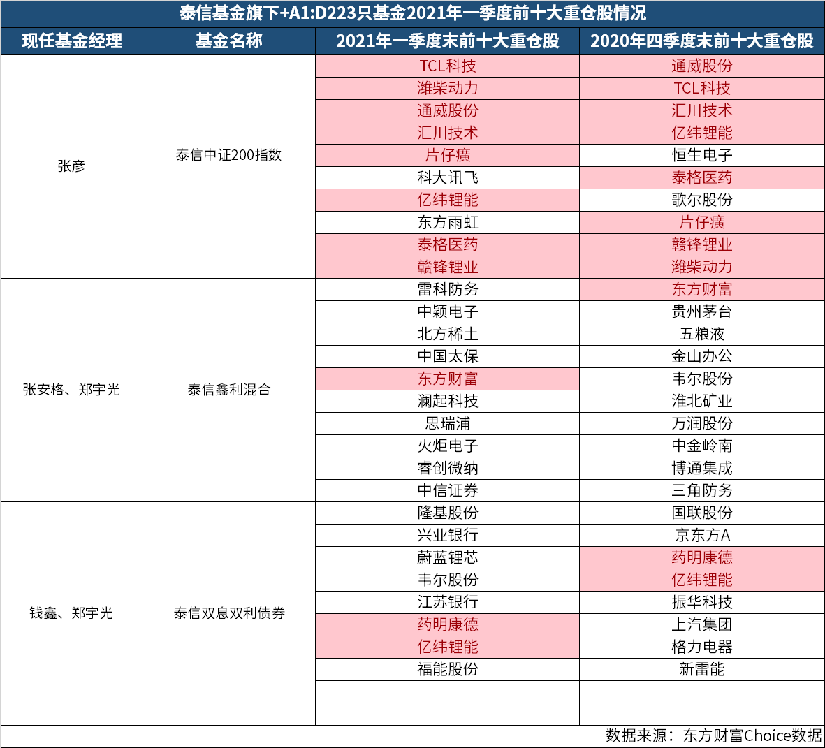 Choice数据显示,截至目前,泰信基金旗下合计基金数量23只,其中有2只基金分别于今年3月24日、4月8日成立,所以并无一季报。