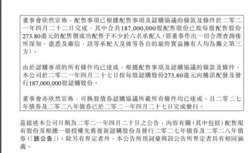 【TechWeb】4月28日消息,美团对外发布公告称,配售事项已根据配售事项及认购协议的条款及条件于2021年4月22日完成,其中合共1.87亿股配售股份已按每股配售股份273.80港元的配售价成功配售予不少于六名承配人。