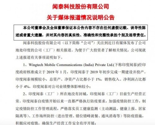 同时,印度闻泰(工厂)所在地没有封城,印度闻泰(工厂)目前生产经营正常。