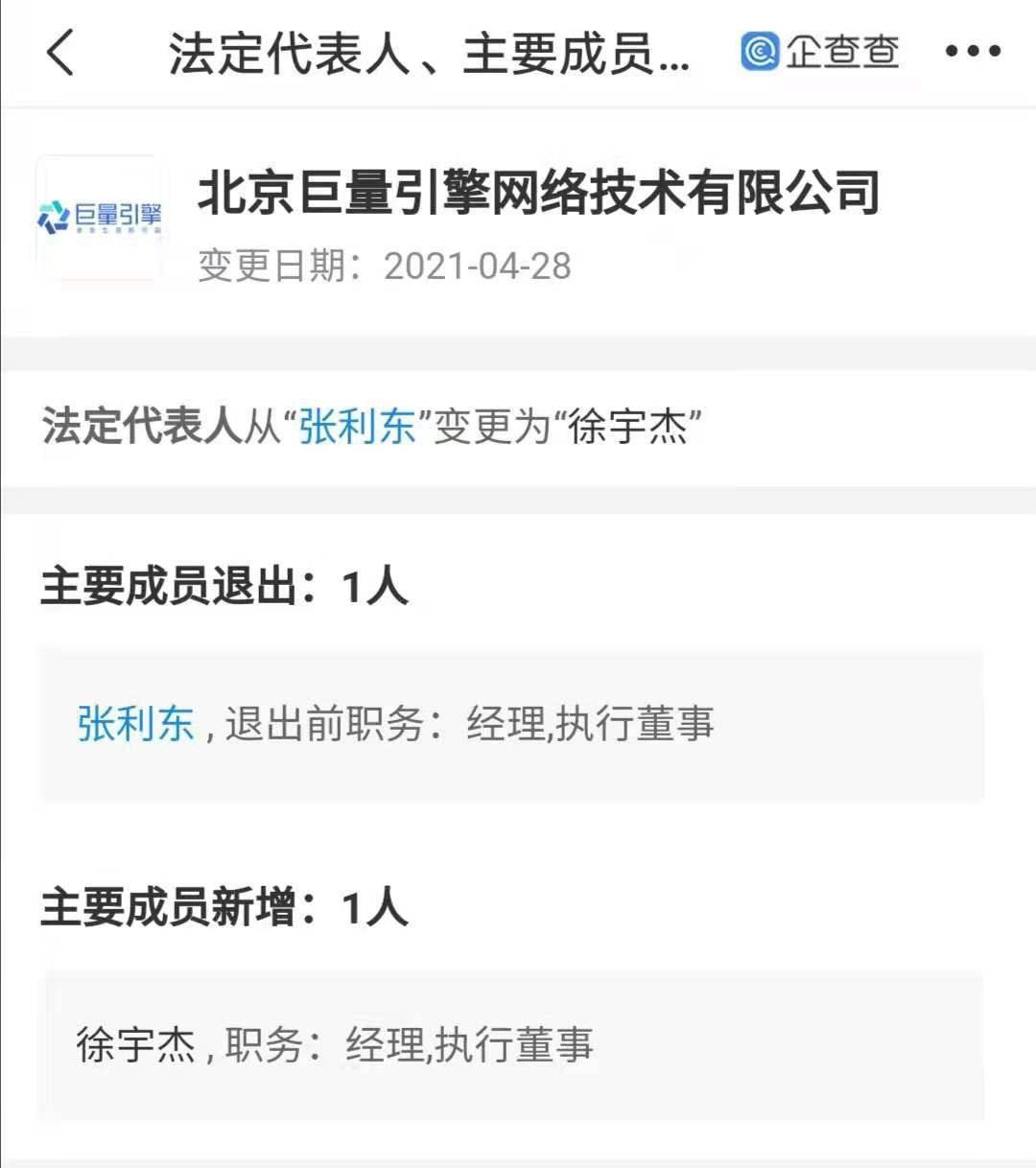 企查查APP显示,近日,北京巨量引擎网络技术有限公司发生工商变更,张利东退出公司法定代表人及经理、执行董事,由徐宇杰接任。企查查信息显示,该公司成立于2016年,注册资本1000万元人民币,经营范围包含:从事互联网文化活动、电子出版物制作、广播电视节目制作、互联网信息服务、经营电信业务等,由今日头条有限公司100%控股。