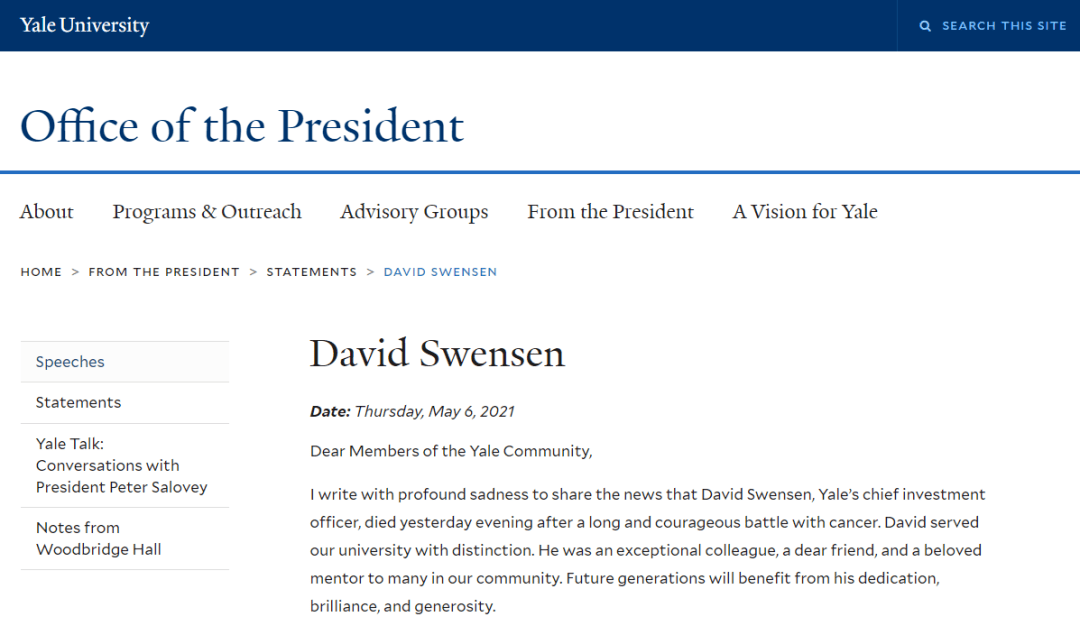耶鲁大学在其官网发布了悼念信,作为大卫·史文森的学生、高瓴资本创始人兼首席执行官张磊凌晨2点发文哀悼恩师,感慨“传奇永不落幕”。但斌、王庆、杨天南等多位中国知名投资人也在社交媒体发文悼念。