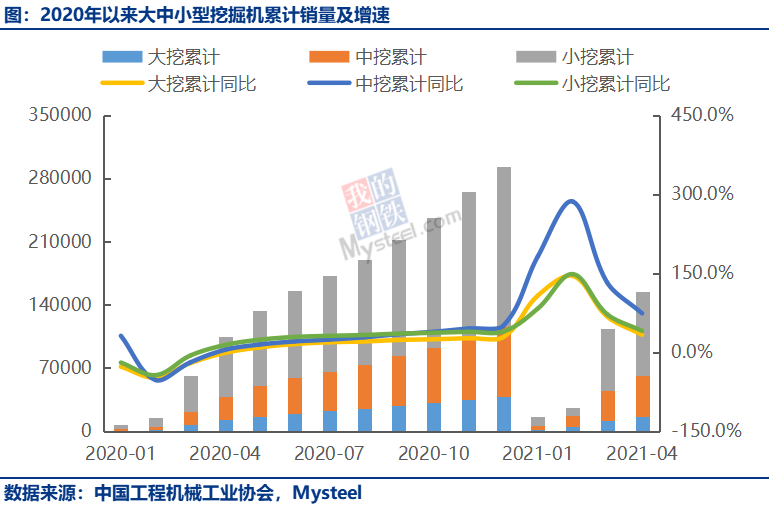 据中国工程机械工业协会对26家挖掘机制造企业统计,2021年4月销售各类挖掘机46572台,同比增长2.52%;其中国内41100台,同比下降5.24%;出口5472台,同比增长166%。