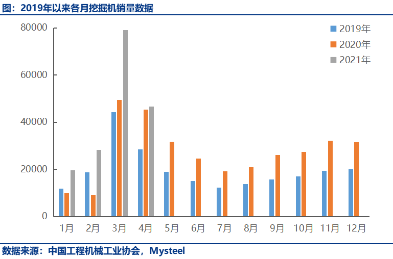 4月挖掘机国内销量4.1万台,同比下降5.2%。1-4月挖掘机国内销量154665台,同比增长47.8%。4月国内销量出现下滑,是继2020年2月以来首次出现同比下降。剔除去年一季度疫情影响月份,是自2019年6月以来首度出现负增长。这主要是因为去年4月基数高,再加上今年受就地过年政策影响,2021年传统春节销售旺季前移,2、3月市场销量远超预期,导致4月市场降温明显。
