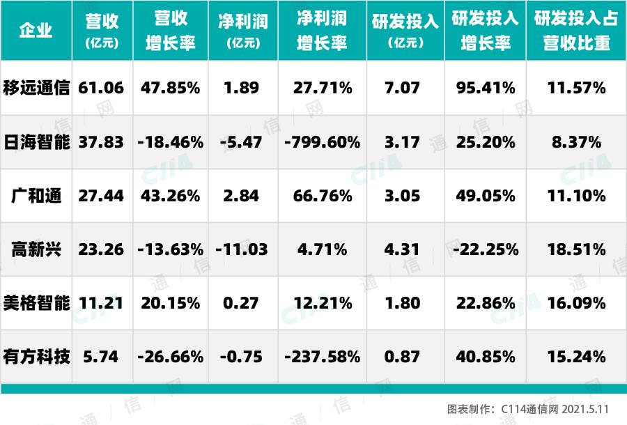截止2021年4月30日,通信模组行业六家上市公司,移远通信、日海通讯、广和通、高新兴、美格智能、有方科技2020年业绩报告全部出炉。C114整理其关键数据点如下。