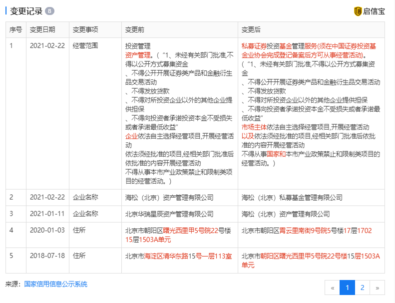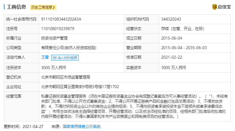 据启信宝显示,根据视频号上“不得不佛系的老王”认证显示,其为北京华瑞星辰资产管理有限公司总经理王雷,该公司原名为北京华瑞星辰资产管理有限公司,在2021年1月和2月进行两次更名,目前企业名称为海松(北京)私募基金管理有限公司。华瑞星辰资产成立于2015年4月,注册资本3000万人民币。成立之初,法定代表人为王伟,2017年8月法人变更为现在的王雷。