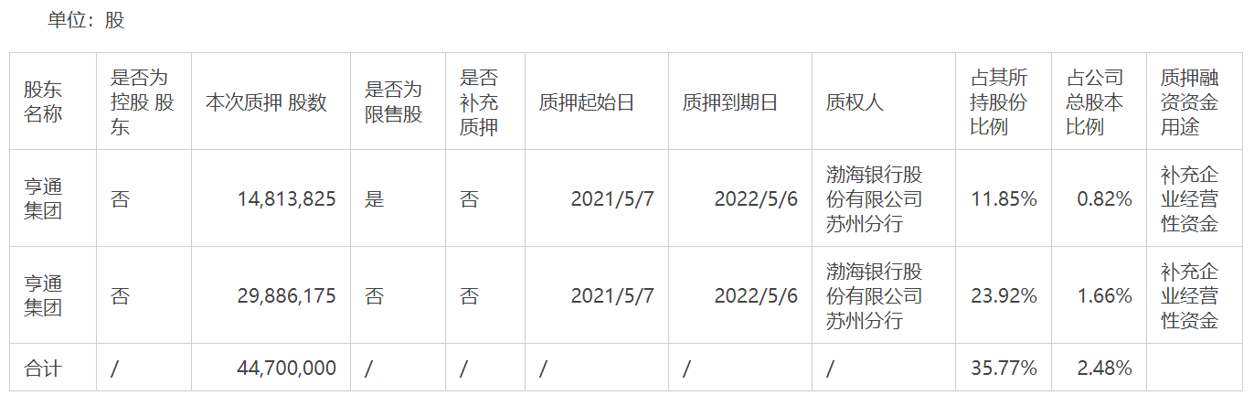 公告同时提到,为补充企业经营性资金,2021年5月7日,亨通集团在中国证券登记结算上海分公司办理了将其持有的1481.38万股限售流通股和2988.62万股公司非限售流通股质押给渤海银行股份有限公司苏州分行的质押手续,相关手续于2021年5月10日办理完毕。