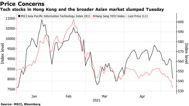 香港科技股和亚洲股市周二大幅下跌/数据来源:彭博社