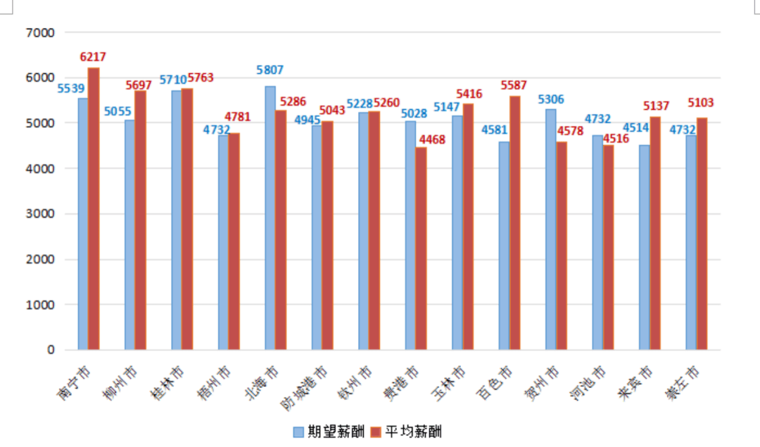 此外,广西区内各市的用人单位提供的薪酬水平分布中,区内工作地在南宁市的用人单位提供的职位平均薪酬水平较高,达到6217元/月。