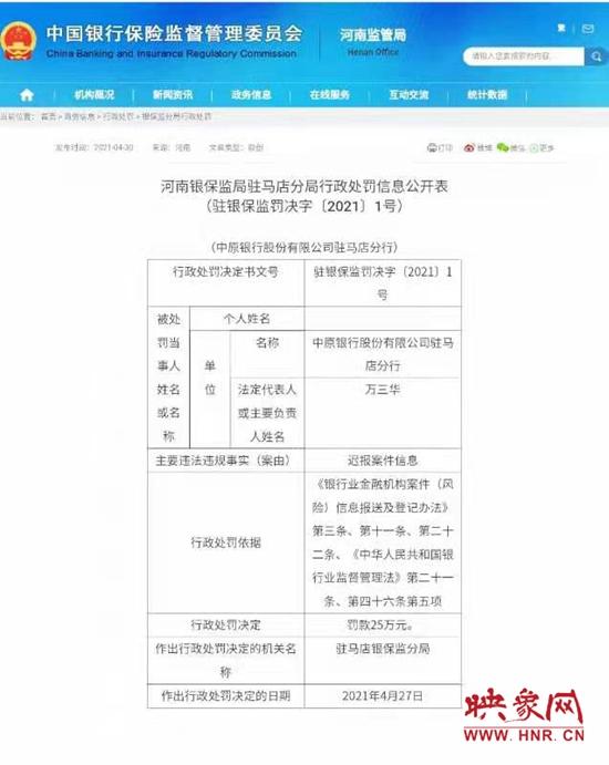 处罚决定书显示,中原银行股份有限公司驻马店分行(负责人万三华)主要违法事实是迟报案件信息,依据《银行业金融机构案件(风险)信息报送及登记办法》第三条、第十一条、第二十二条、《中华人民共和国银行业监督管理法》第二十ー条、第四十六条第五项,予以处罚25万元。