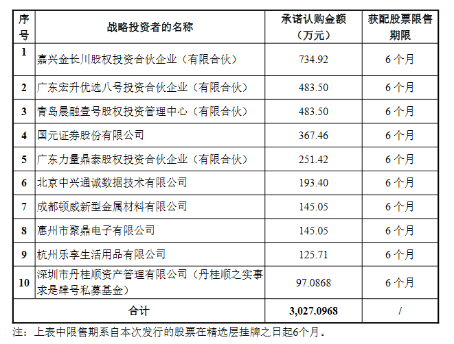挖贝网注意到,德瑞锂电此次精选层公开发行吸引到10家战投,共拟认购金额为3,027.0968万元。其中,嘉兴金长川股权投资合伙企业(有限合伙)承诺认购金额为734.92万元,广东宏升优选八号投资合伙企业(有限合伙)、青岛晨融壹号股权投资管理中心(有限合伙)均拟认购483.50万元,国元证券股份有限公司拟认购367.46万元,深圳市丹桂顺资产管理有限公司(丹桂顺之实事求是肆号私募基金)拟认购97.0868万元。