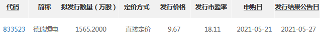 挖贝网 5月18日,德瑞锂电(833523)精选层发行价出炉,公司采用直接定价的方式确定发行价为9.67元/股,发行市盈率为18.11倍。股票将于5月21日申购,发行代码为“889128”。