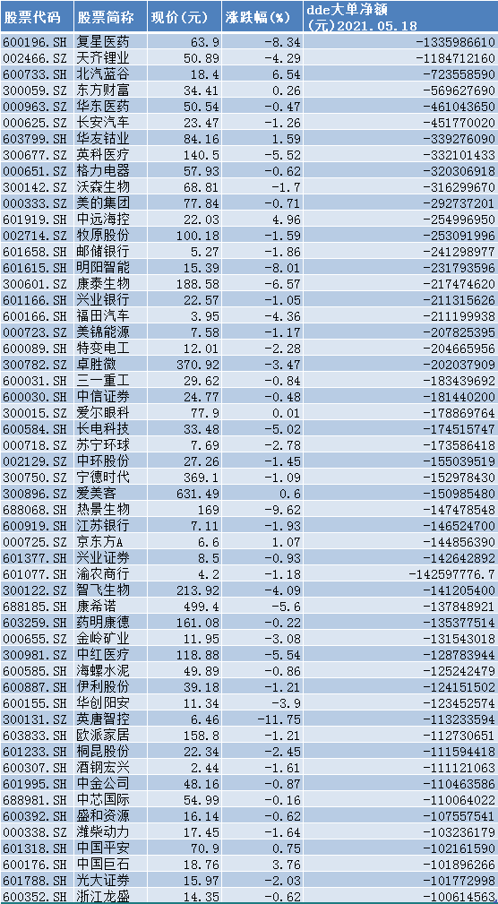 5月18日主力大单抛售超亿元个股: