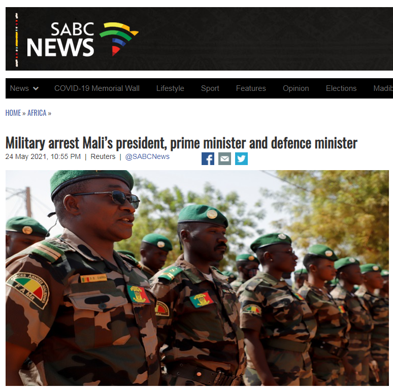 据南非国家广播公司当地时间5月24日报道,西非国家马里的军方于当日将过渡政府总统巴·恩多、过渡政府总理瓦内、国防部长苏雷曼等人扣留在了首都巴马科外的卡蒂军营。