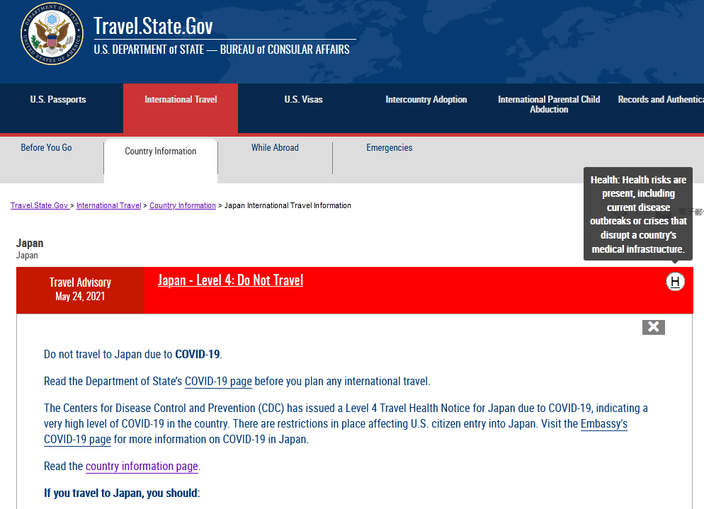 当地时间5月24日,美国国务院针对日本东京奥运会的旅行问题发出“第四级:不要旅行”的警告,这是美国国务院有关旅行建议的最高级别警告。