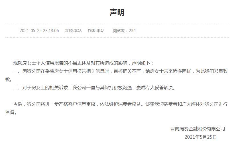 中新经纬客户端5月26日电 25日深夜,晋商消费金融股份有限公司(下称“晋商消金”)官网发布声明称,因我公司在采集房女士信用报告相关信息时,审核把关不严,给房女士带来诸多困扰,为此我们郑重致歉。