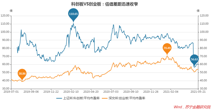 盈利的释放快速压低估值水平。随着年报、1季报于4月底披露完毕,2021年5月的第一个交易日,科创板平均市盈率由节前的86.48倍骤降至59.01倍,处于板块上市以来最低位置,与创业板的估值差距也大幅收窄。