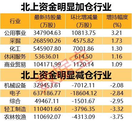 在北上资金持股总量减少的情况下,上周北上资金持股量环比增加的有10个行业。其中,银行行业持股量增加最多,最新持有150.87亿股,较前一周增加1.50亿股;紧随其后的是公用事业、化工行业,持股量较前一周增加10813.75万股、7001.86万股。以增幅进行统计,环比增幅居前的有公用事业、采掘、化工行业,增幅分别为3.21%、1.73%、1.30%。