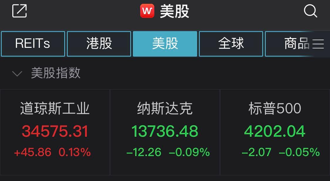 截至收盘,道指涨45.86点,报34575.31点,涨幅为0.13%;纳指跌12.26点,报13736.48点,跌幅为0.09%;标普500指数收跌2.07点,报4202.04点,跌幅为0.05%。
