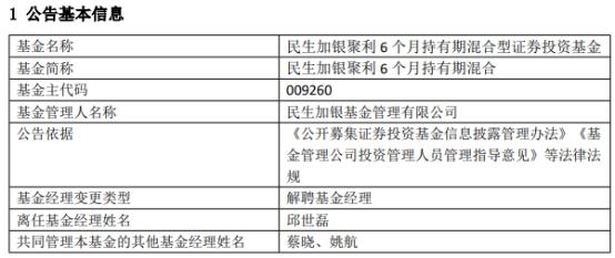 邱世磊离任后,民生加银聚利6个月持有期混合由姚航、蔡晓共同管理,民生加银鹏程混合由柳世庆、关键共同管理,另外3只基金则由关键独立管理。