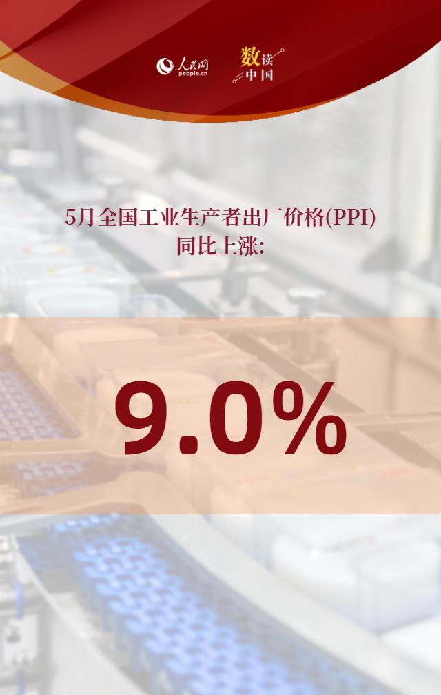 人民网北京6月9日 (申佳平)据国家统计局官网消息,2021年5月份,全国工业生产者出厂价格同比上涨9.0%,环比上涨1.6%。国家统计局城市司高级统计师董莉娟表示,5月份,国际原油、铁矿石、有色金属等大宗商品价格大幅上涨,国内需求稳定恢复,我国工业品价格继续上涨。