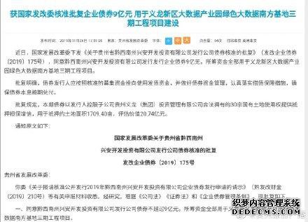近日,国家发展改革委下发《关于贵州省黔西南州兴安开发投资有限公司发行公司债券核准的批复》(发改企业债券〔2019〕175号),同意黔西南州兴安开发投资有限公司发行发行企业债券9亿元,所筹资金全部用于义龙新区大数据产业园绿色大数据南方基地三期工程项目。