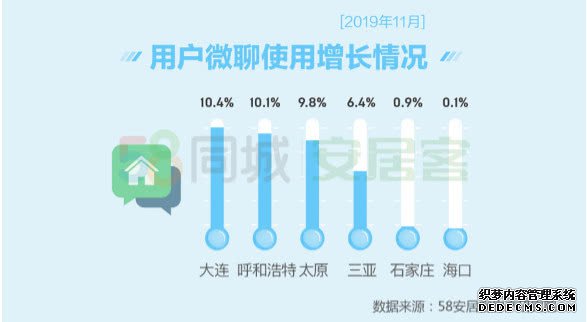 根据58同城、安居客《11月国民安居指数报告》中对用户咨询行为的数据统计,11月全国城市来电量排名前三的城市是吉林市、珠海市、乌鲁木齐市,来电量环比增幅分别达到17.6%、15.4%和10.6%。从微聊使用情况来看,大连市、呼和浩特市、太原市主动微聊用户数环比增长分别为10.4%、10.1%和9.8%。吉林市、大连市等城市的咨询热度提高都与人才政策有关,通过放宽落户政策,发放人才住房补贴,进行就业创业补助等,这些城市吸引了人才入驻,继而带动购房咨询量的增加。