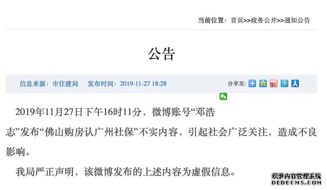佛山市住建局公告称:2019年11月27日下午16时11分,微博账号“邓浩志”发布“佛山购房认广州社保”不实内容,引起社会广泛关注,造成不良影响。对此,佛山市住建局严正声明,该微博发布的上述内容为虚假信息。