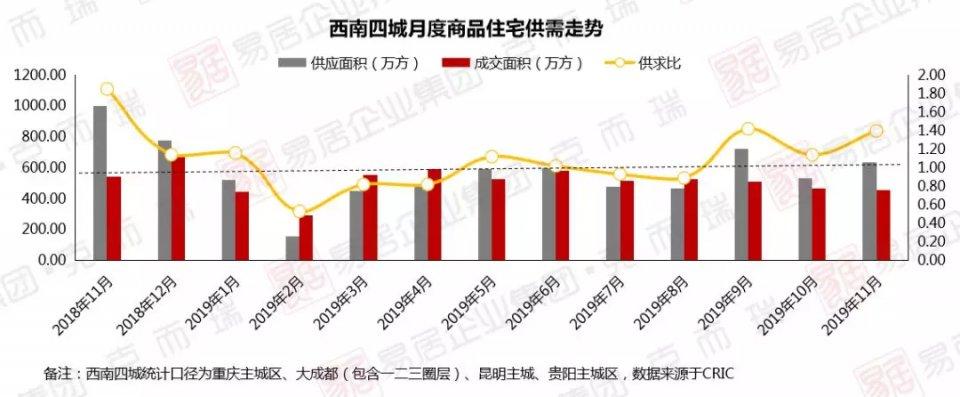 11月西南四城商品住宅供应面积633.34万㎡(高于近6月平均供应面积571.91万㎡),环比上涨18.96%、同比下降36.77%;