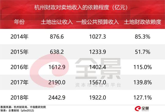 2018年,杭州的土地出让金便高达2442.9亿元,比一般公共预算收入多出520亿元,对土地财政依赖度(卖地收入/一般公共预算收入)居全国首位。