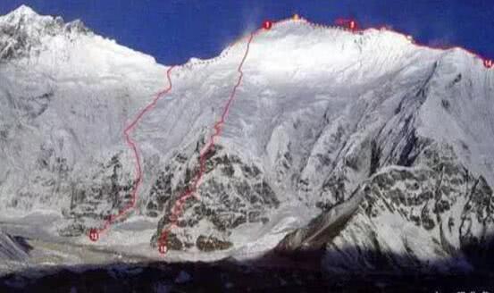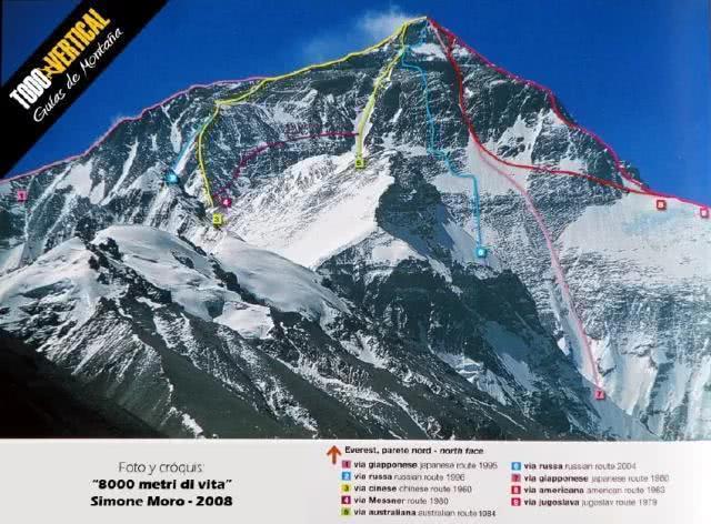 2.北壁路线有9条,1996年俄罗斯“北-北东沟槽”,2004年俄罗斯的“北壁中央直上”其余路线最后汇集峰顶下方的诺顿沟槽或Hornbein沟槽。