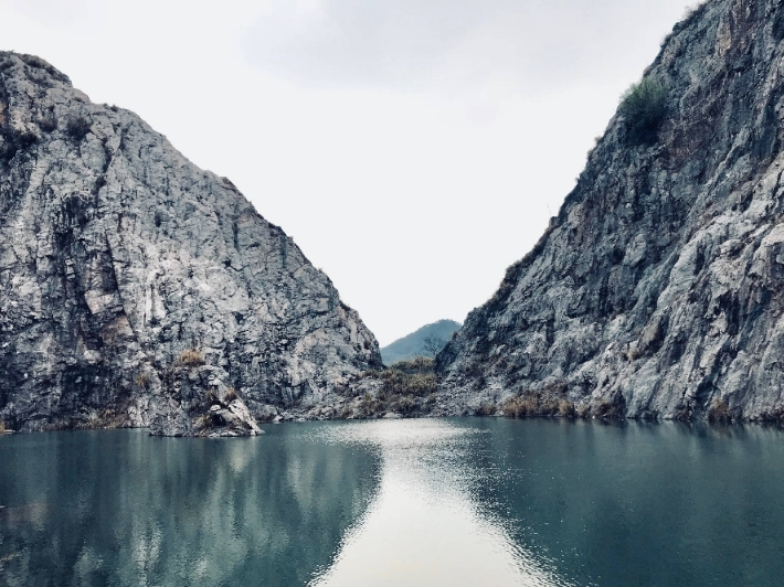 2、湖后面是两座山,山上并没树,石块拍出来有一种粗粝感,很像在冰岛的感觉;