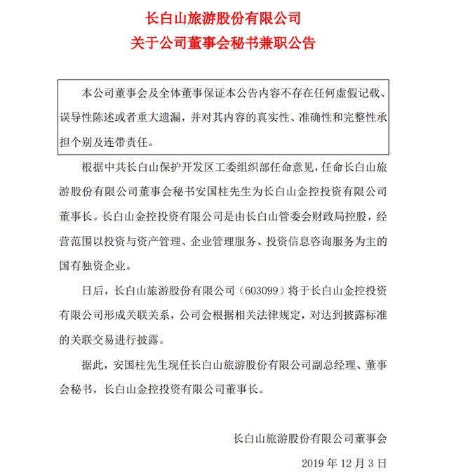 根据中共长白山保护开发区工委组织部任命意见,任命长白山旅游股份有限公司董事会秘书安国柱先生为长白山金控投资有限公司董事长。长白山金控投资有限公司是由长白山管委会财政局控股,经 营范围以投资与资产管理、企业管理服务、投资信息咨询服务为主的 国有独资企业。