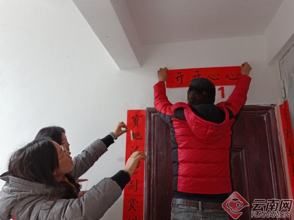 结对干部为搬迁入住贫困群众张贴对联。通讯员 黄桦 摄