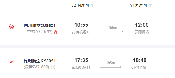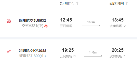 昆航执飞的KY3005/6,08:00由太原起飞,09:00到达大同,09:50由大同起飞,10:45到达太原,每周二、四、六执行,KY3021/2,17:35由太原起飞,18:40到达大同,19:25由大同起飞,20:25到达太原,每天一班。