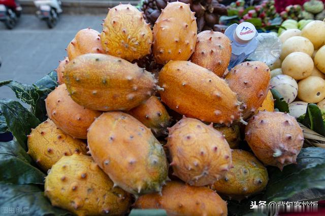 火参果学名刺角瓜,原产于非洲,近两年开始流行于各个旅游景区,在很多旅游景区都会见到有人叫卖火参果,在凤凰古城也不例外,由于特别的造型和鲜艳的外表,出于好奇,没有见过的游客见到火参果都会买来品尝,吃的时候要用吸管,味道甘酸,可食用的部分很少,并且价钱普遍较贵,也是好看不不好吃的代表之一。