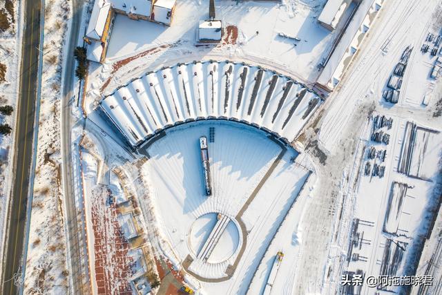 横道河子镇最出名的是中东铁路当时规模最大的扇形机车库,那建筑造型简直美呆了,无人机飞上去,这就像是一台拉开的手风琴,太特别了。我们的行程给横道河子镇的时间终究还是太少了,我都来不及去亲近这个机车库,它用了近百年的时间,一直到了上世纪九十年代才退休。