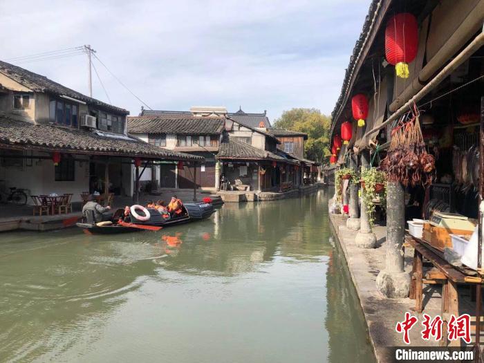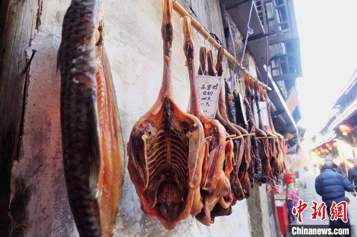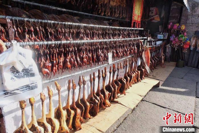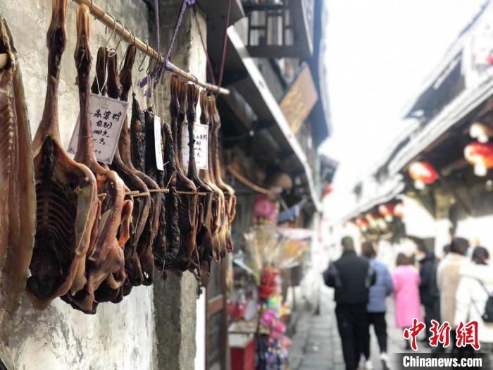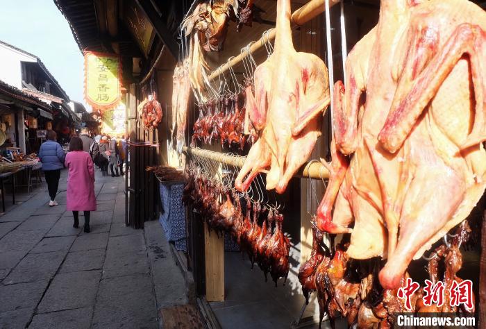 安昌古镇。 李典 摄 在“江南水乡”浙江省绍兴市柯桥区安昌古镇,“酱民”趁着晴朗天气“酱”起了年货。酱鸭、酱鱼、酱鹌鹑、腊肠……古镇小河畔“酱香”四溢,游客们寻着“腊味”而至,感受冬日里的新春暖意。
