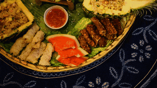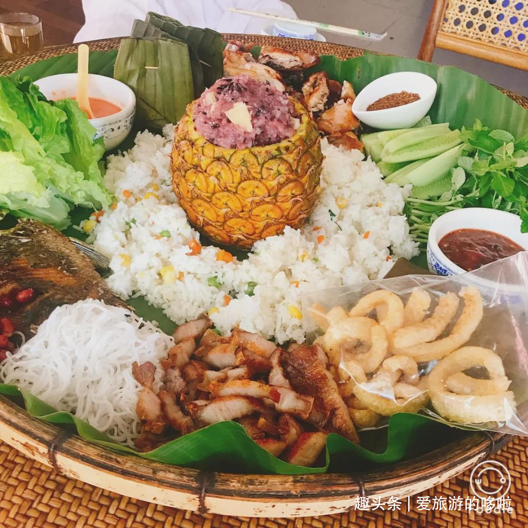 巨型的芭蕉叶上摆放着各种美食,在版纳,没有什么是一片芭蕉叶和箩筐装不下的。